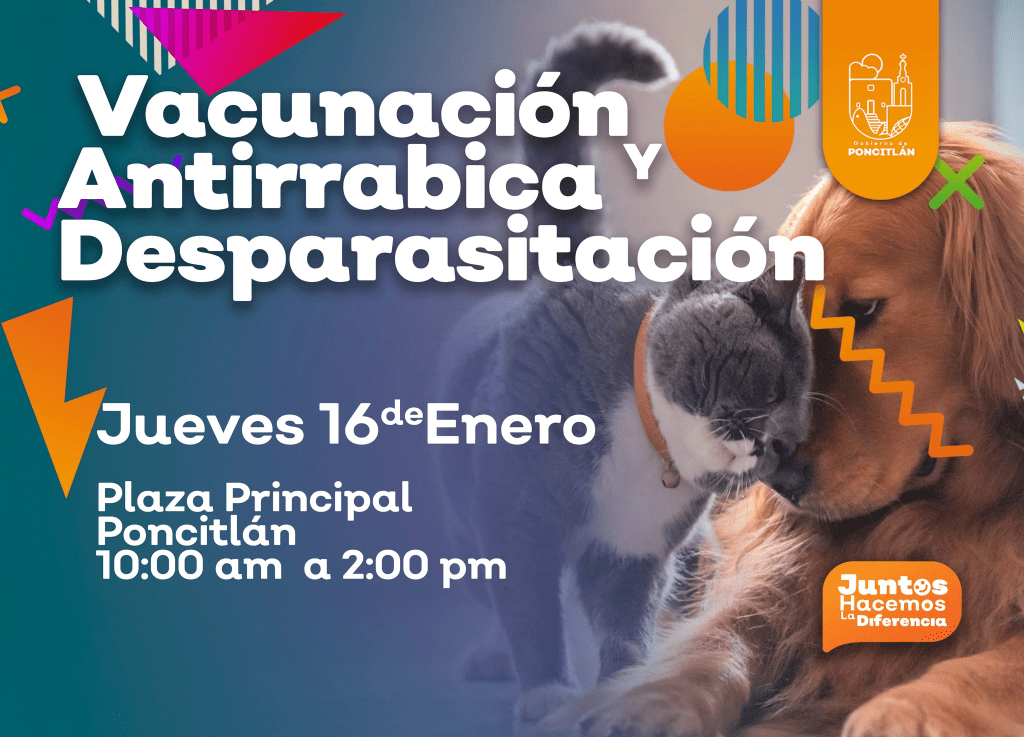 El próximo 16 de enero, el departamento de protección y salud animal llevará a cabo una jornada de desparasitación y vacunación antirrábica para perros y gatos en la plaza principal de Poncitlán desde las 10am hasta las 2pm. La desparasitación será a bajo costo, y la vacunación será gratuita.