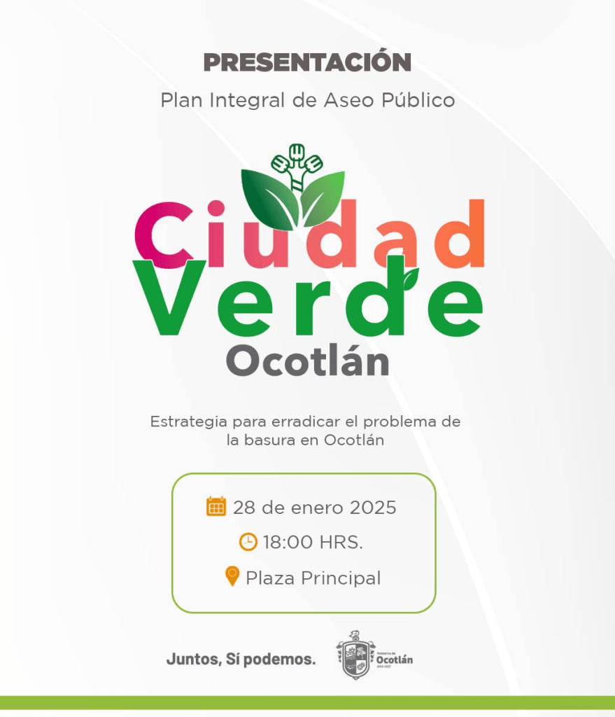Atreves de sus rede sociales el Gobierno de Ocotlán invita a la presentación de el Plan Integral de Aseo Público: #CiudadVerde, la cual es una estrategia creada con amor por nuestra comunidad para erradicar la basura y construir juntos un Ocotlán más limpio, verde y lleno de vida.