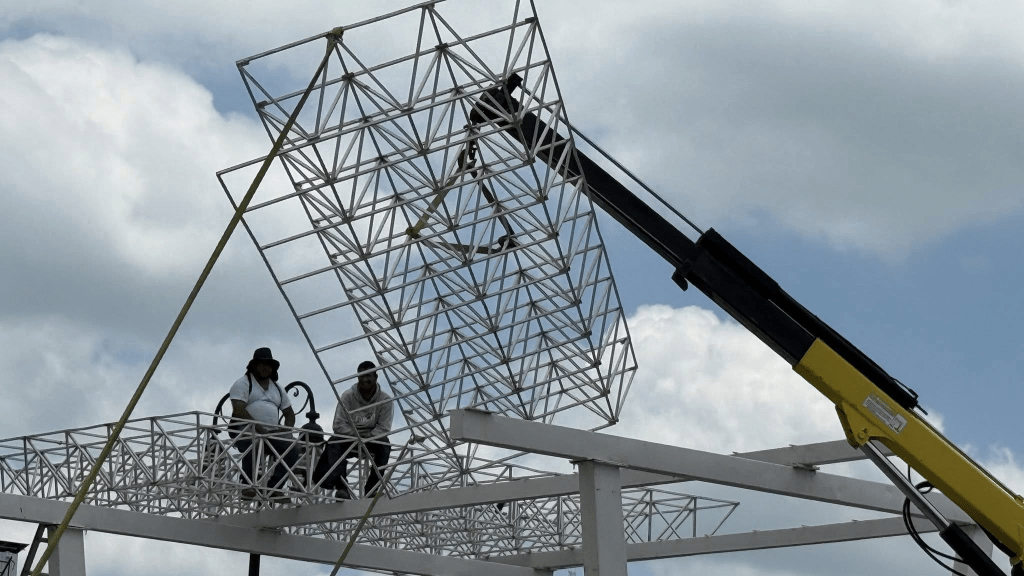 Personal de logística trabaja en el montaje del templete que será utilizado durante la ceremonia, en la que miles de peregrinos y fieles se reunirán para presenciar este momento de profunda devoción, enmarcado por cantos, oraciones y el respeto de una tradición que ha trascendido generaciones.