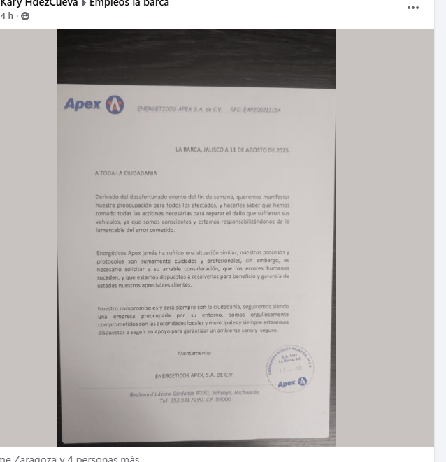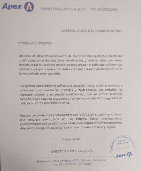 La empresa Energeticos Apex S.A. de C.V. emitió un comunicado oficial dirigido a la ciudadanía, en el que reconoce su responsabilidad por un incidente ocurrido el pasado fin de semana que provocó daños a vehículos en el municipio.