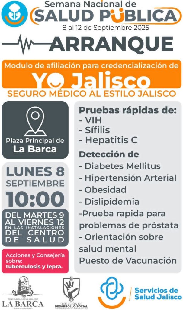 Del 8 al 12 de septiembre, el municipio de La Barca, Jalisco, será sede de la Semana Nacional de Salud Pública, una iniciativa que busca acercar servicios médicos preventivos a la población y fortalecer el bienestar comunitario.