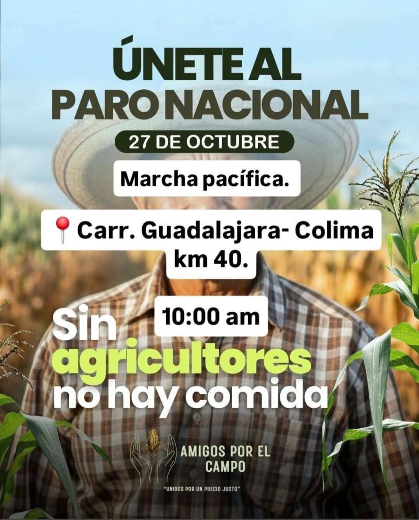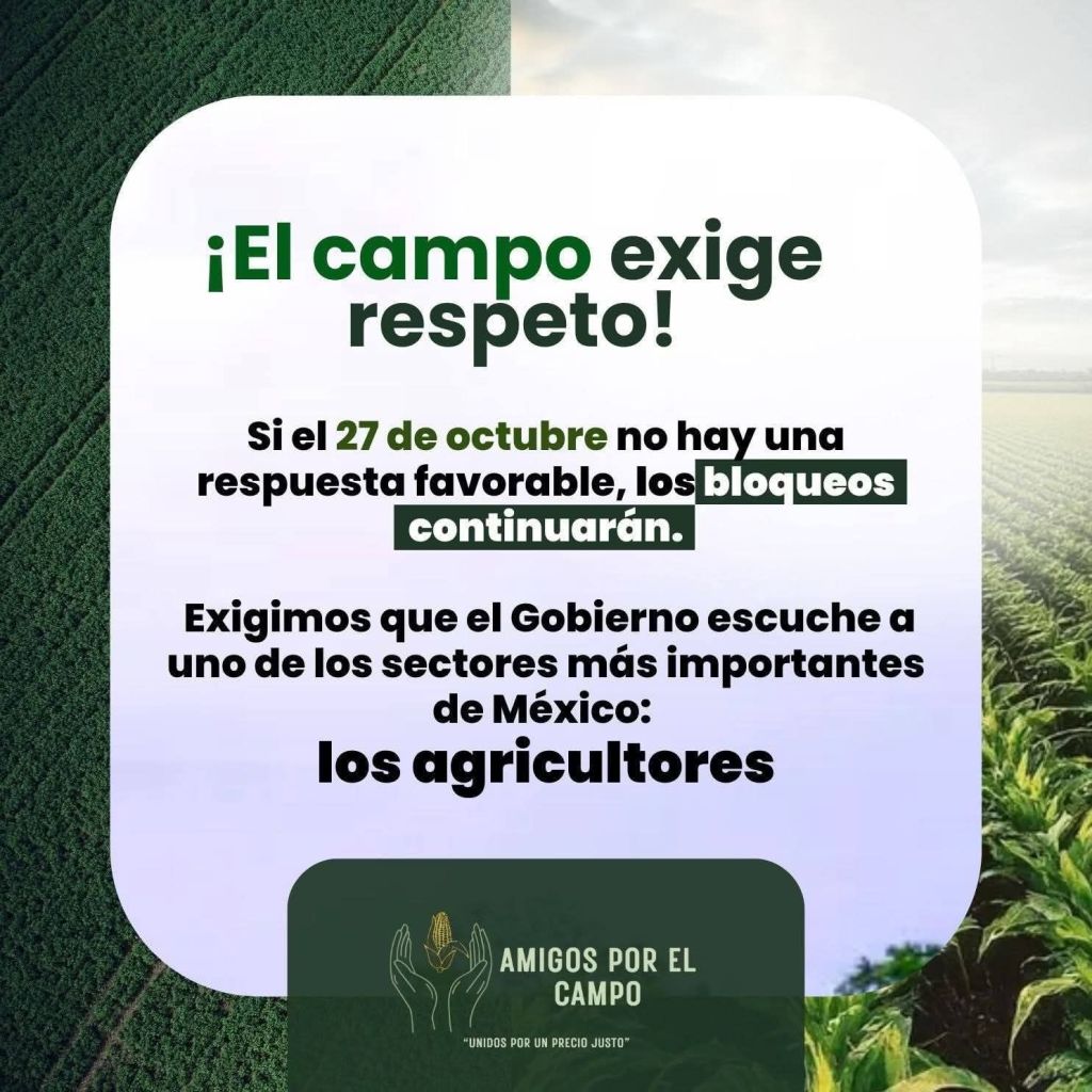 La agrupación de agroproductores lanzó una advertencia clara: si el Gobierno Federal no responde favorablemente a sus demandas este lunes 27 de octubre, los agricultores iniciarán bloqueos carreteros en distintos puntos de Jalisco.