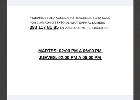 Las personas interesadas en solicitar información o programar una consulta deberán comunicarse únicamente por llamada o mensaje de WhatsApp al número 393 117 81 85, en los siguientes horarios: