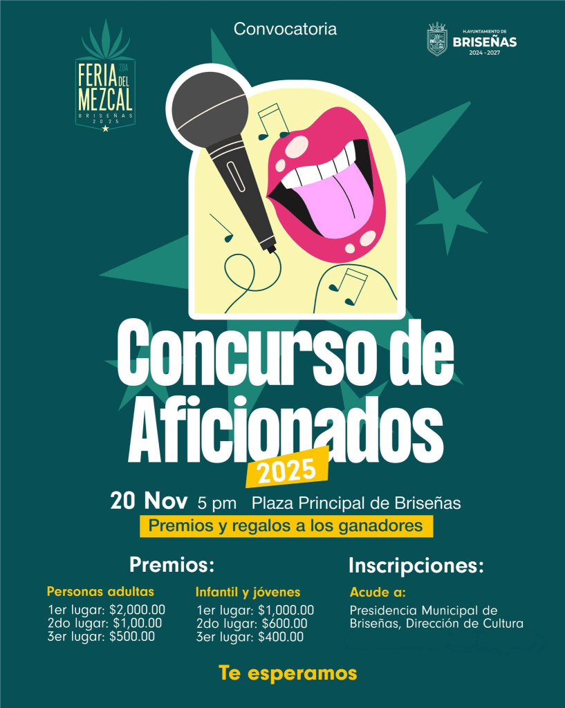 El Gobierno Municipal de Briseñas 2024-2027 invita a la ciudadanía a participar en el Concurso de Aficionados Briseñas 2025, que se realizará en el marco del Aniversario de la Revolución Mexicana y la Feria del Mezcal.