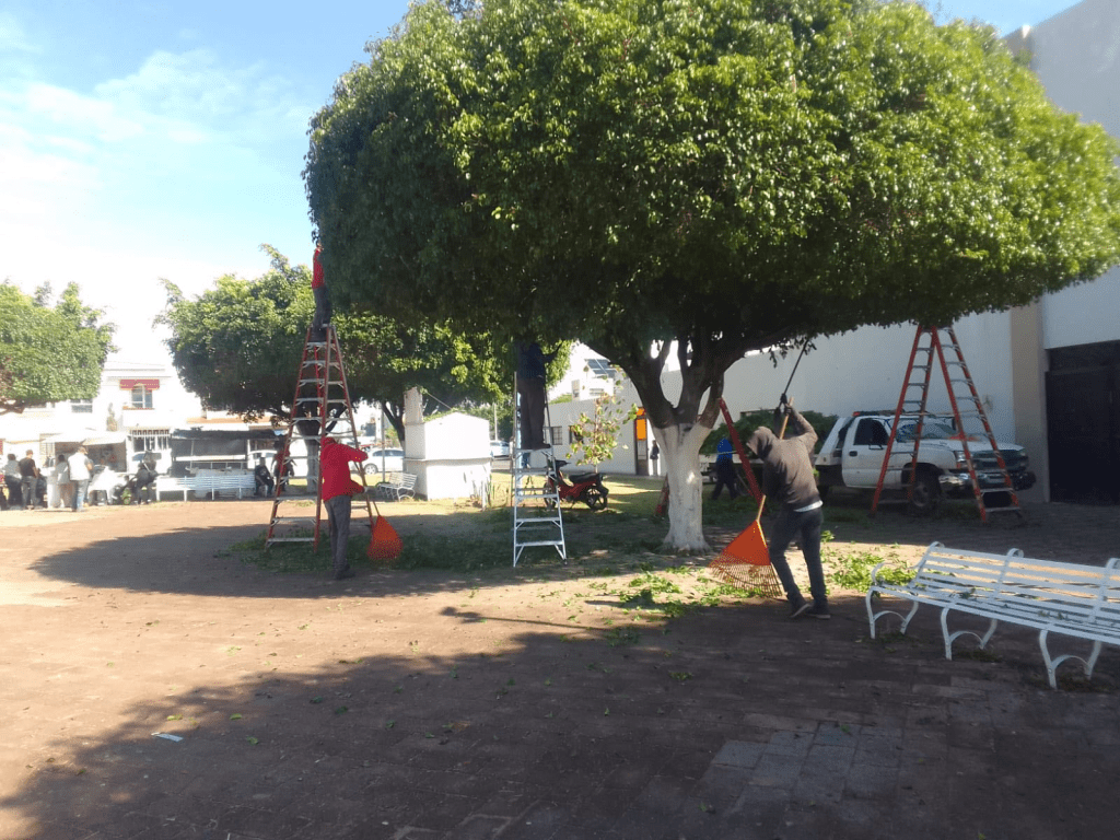 Las labores incluyeron la poda de árboles en la plaza principal de la colonia, así como la instalación de nuevos focos y la optimización de la iluminación en el kiosco y sus alrededores.