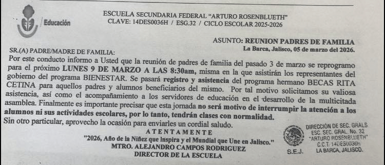 La dirección de la escuela informa a la comunidad que la reunión de padres de familia programada originalmente para el día 3 de marzo ha sido reprogramada y se llevará a cabo el próximo lunes 9 de marzo de 2026, a partir de las 08:30 a.m.