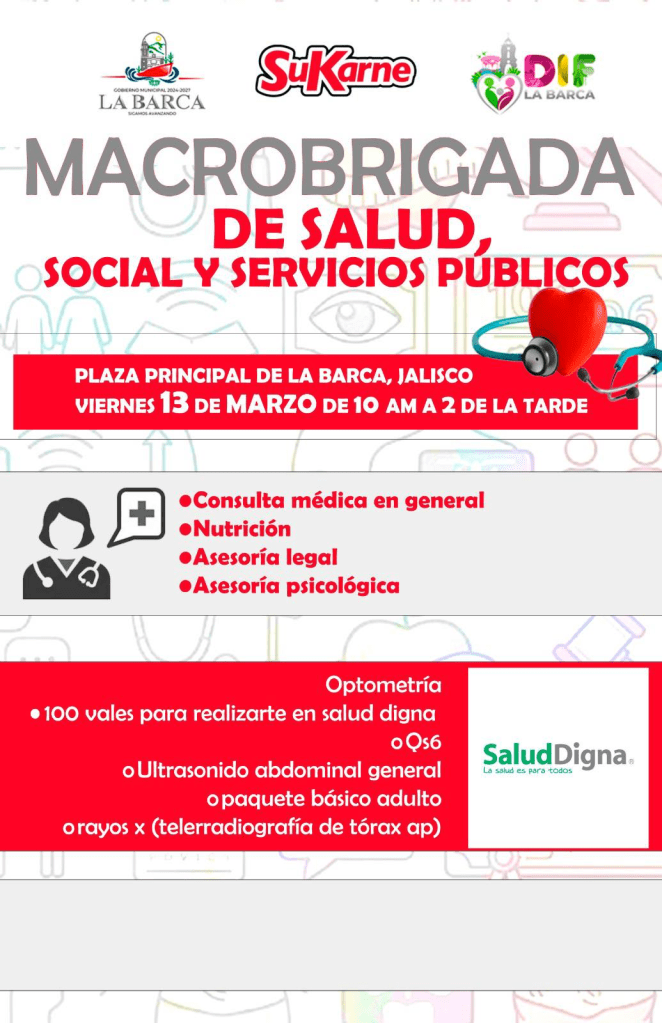 El Sistema DIF Municipal, en coordinación con SuKarne y el Gobierno de La Barca, invita a toda la ciudadanía a participar en la Macro Brigada de Salud Social y Servicios Públicos.