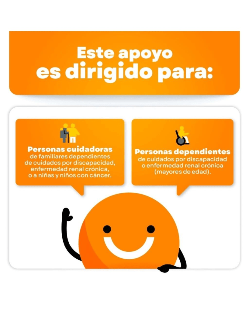Este programa reconoce y acompaña a quienes dedican su tiempo al cuidado de familiares dependientes por discapacidad, enfermedad renal crónica o niñas y niños con cáncer, así como a personas mayores de edad que viven con discapacidad o enfermedad renal crónica.