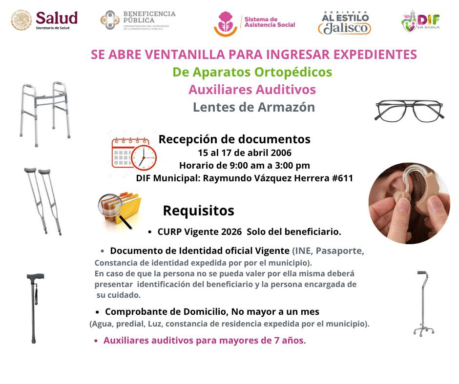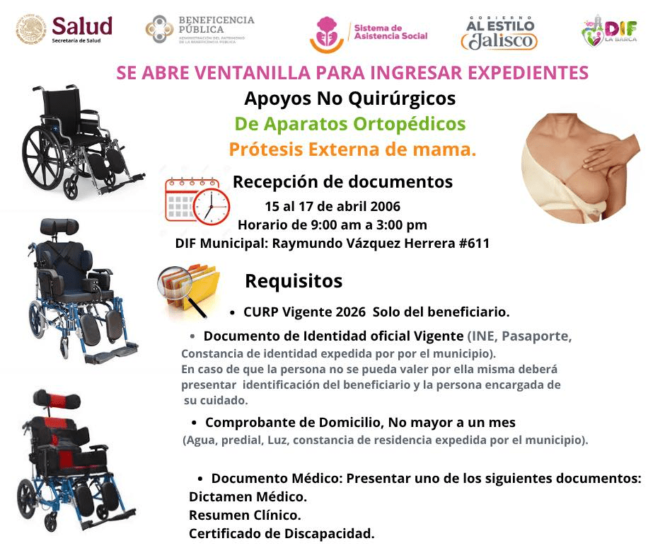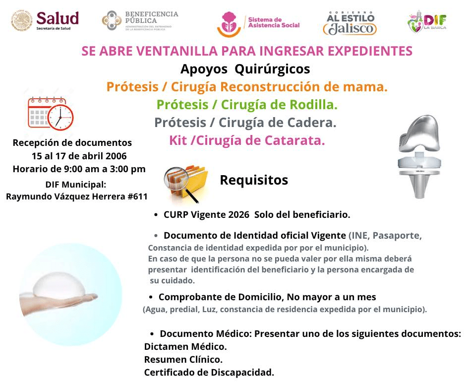 El Sistema DIF Municipal de La Barca, en coordinación con la Secretaría de Asistencia Social de Jalisco, la Secretaría de Salud Federal y la Beneficencia Pública, anunció la apertura de una convocatoria de apoyos en salud completamente gratuitos dirigida a la ciudadanía.